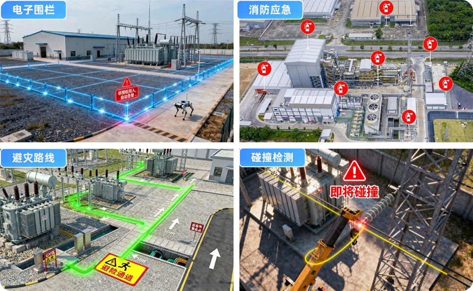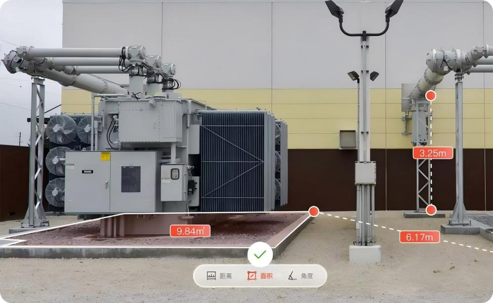 無需現(xiàn)場人工測量,即可在模型中對任意兩點距離、設備占地面積、導線安全距離等進行高精度量算。